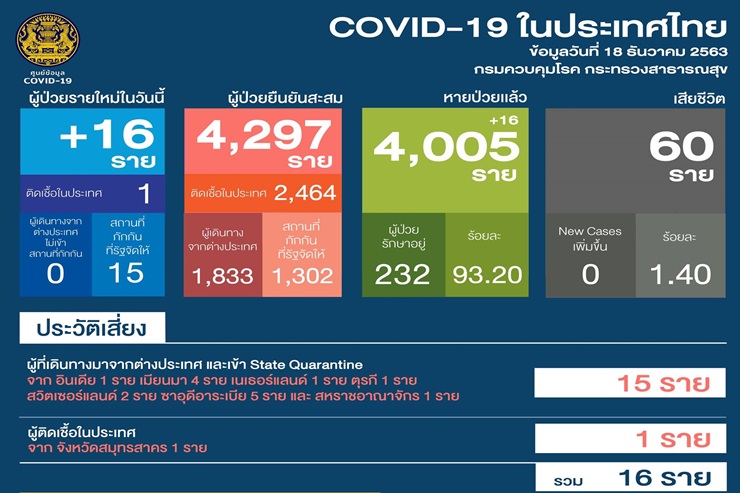 -พบผู้ป่วยยืนยันติดเชื้อรายใหม่เพิ่ม 16 ราย โดย 1 ราย ติดเชื้อในประเทศ เป็นแม่ค้า อายุ 67 ปี จ.สมุทรสาคร ขณะที่ อีก 15 คน เป็นผู้เดินทางมาจากต่างประเทศและเข้าสถานกักกันที่รัฐจัดให้ (Quarantine Facilities) ประกอบด้วย อินเดีย 1 ราย เมียนมา 4 ราย เนเธอร์แลนด์ 1 ราย ตุรกี 1 ราย สวิตเซอร์แลนด์ 2 ราย ซาอุดิอาระเบีย 5 ราย และสหราชอาณาจักร 1 ราย