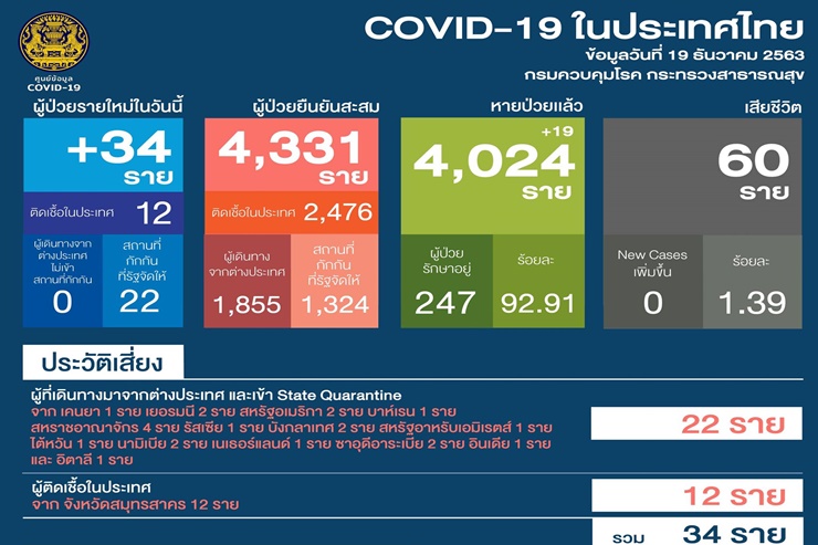เมื่อวันที่ 19 ธ.ค. 63 ศูนย์บริหารสถานการณ์โควิด-19 (ศบค.) รายงานสถานการณ์การแพร่ระบาดของไวรัสโควิด-19 ในประเทศประจำวันดังนี้