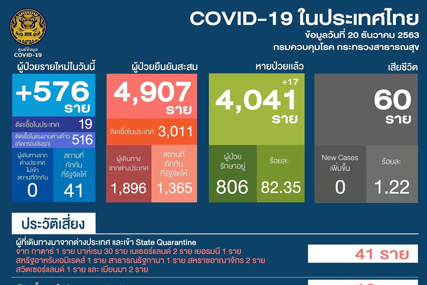 เมื่อวันที่ 20 ธ.ค. 63 ศูนย์บริหารสถานการณ์โควิด-19 (ศบค.) รายงานสถานการณ์การแพร่ระบาดของไวรัสโควิด-19 ในประเทศดังนี้