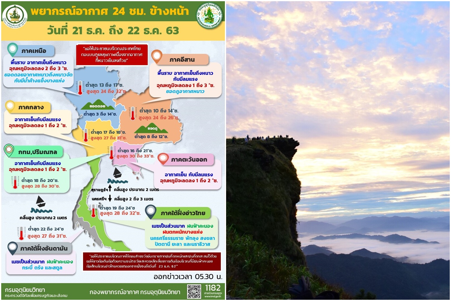 เมื่อวันที่ 21 ธ.ค. 63 กรมอุตุนิยมวิทยารายงาน ลักษณะอากาศทั่วไปว่า พยากรณ์อากาศ 24 ชั่วโมงข้างหน้า บริเวณความกดอากาศสูงหรือมวลอากาศเย็นกำลังค่อนข้างแรงอีกระลอกจากประเทศจีนได้แผ่ลงมาปกคลุม ถึงประเทศไทยตอนบนแล้ว