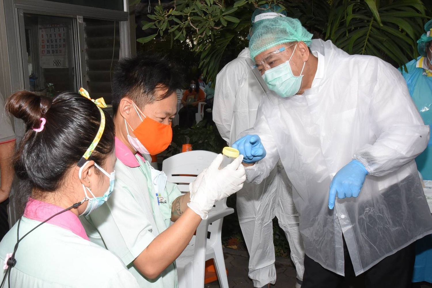สำหรับวันนี้กรุงเทพมหานคร โดยสำนักอนามัยได้จัดส่งเจ้าหน้าที่จากสำนักอนามัย และศูนย์บริการสาธารณสุข 42 (ถนอม ทองสิมา) ร่วมกับสำนักงานเขตบางขุนเทียน มาดำเนินการตรวจคัดกรองกลุ่มสัมผัสเสี่ยงรองลงมาเพิ่มเติม จำนวน 199 คน ซึ่งมีทั้งแรงงานคนไทยและแรงงานต่างชาติ ด้วยวิธีการเก็บน้ำลายส่งตรวจที่แล็บของโรงพยาบาลรามาธิบดี โดยขั้นตอนการดำเนินการ เริ่มด้วยการสอบประวัติผู้ตรวจ จากนั้นผู้ตรวจรับกระปุกเก็บน้ำลายซึ่งจะมีน้ำยา normalsaline 0.9%อยู่ภายใน ให้ผู้ตรวจอมน้ำลายไว้ในปาก 5 นาที แล้วบ้วนน้ำลายอย่างน้อย 2 ซีซี ลงในกระปุก สำหรับวิธีการตรวจจากน้ำลายนี้สามารถตรวจหาเชื้อโควิด-19 ได้เร็วกว่าการทำ SWAB ความน่าเชื่อถือของผลการตรวจสอบอยู่ที่ 90% ส่วนการทำ SWAB ผลเชื่อถือได้ 95% ทั้งนี้หากตรวจน้ำลายแล้วพบมีผู้ติดเชื้อโควิด-19 จะมีการทำ SWAB ผู้นั้นซ้ำอีกครั้งเพื่อยืนยันผลการตรวจที่ชัดเจนต่อไป