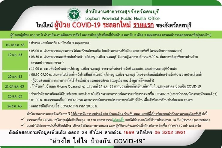 เมื่อวันที่ 27 ธ.ค. 63เพจเฟซบุ๊ก “สำนักงานสาธารณสุขจังหวัดลพบุรี” โพสต์ข้อความแจ้งไทม์ไลน์ ผู้ป่วย โควิด-19 ระลอกใหม่ รายแรก ของจ.ลพบุรี โดยผลการตรวจยืนยัน ณ เวลา 20.00 น. ของวันที่ 26 ธ.ค. 63 เป็นผู้ป่วยหญิงไทย อายุ32ปี ทำงานโรงงานผลิตอาหารสัตว์ และอาศัยอยู่กับเพื่อนที่บ้านพัก ต.มหาชัย อ.เมือง จ.สมุทรสาคร (สวมหน้ากากตลอดเวลาที่อยู่นอกบ้าน)