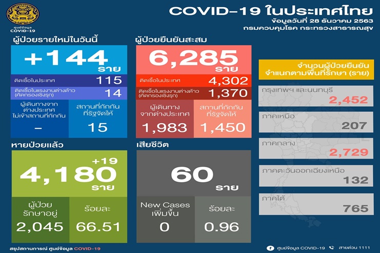 ศบค.เผยสถานการณ์แพร่ระบาดโควิด-19พบผู้ป่วยโควิดรายใหม่ 144ราย ติดเชื้อในประเทศ 115 ราย แรงงานต่างด้าว 14 ราย รวมสะสม 6,285 ราย