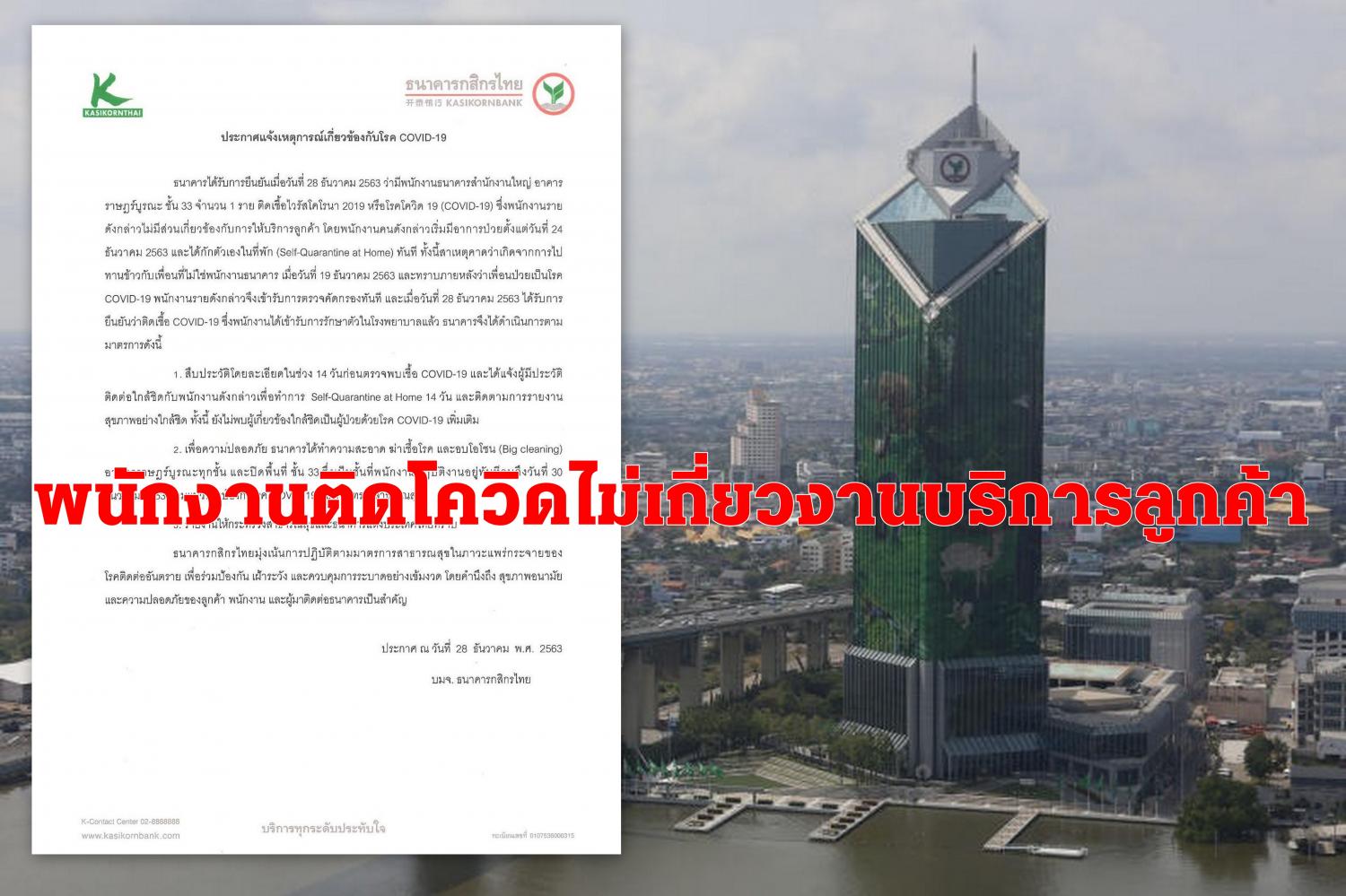 แบงก์กสิกรไทยชี้แจงพนักงานติดโควิด-19 อาคารราษฎร์บูรณะ ชั้น 33 ไม่เกี่ยวข้องส่วนบริการลูกค้า