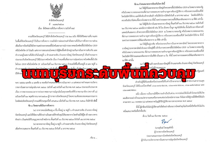 ผู้ว่าฯ นนทบุรี ประกาศกำหนดพื้นที่สถานการณ์แพร่โควิด-19 กำหนดให้ จ.นนทบุรี เป็นพื้นที่ควบคุม ยกเว้นพื้นที่หมู่ที่ 5 และหมู่ที่ 6 ต.เสาธงหิน อ.บางใหญ่ ให้เป็นพื้นที่ควบคุมสูงสุด โดยเฉพาะตลาดกลางบางใหญ่