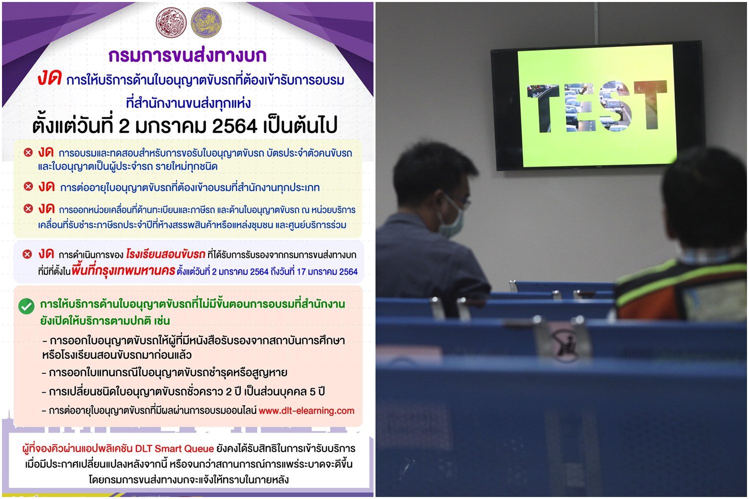 กรมการขนส่งทางบก งดการอบรมและทดสอบเพื่อขอรับใบอนุญาตขับรถและผู้ประจำรถรายใหม่ ที่สำนักงานขนส่งทุกแห่ง ตั้งแต่วันที่ 2 ม.ค. 64