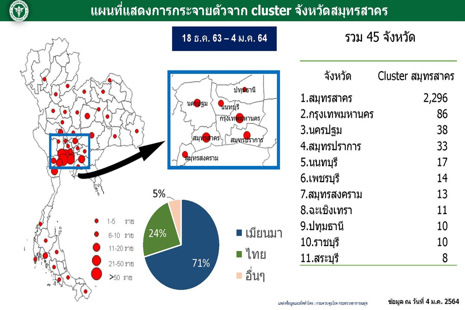 - คลัสเตอร์จังหวัดสมุทรสาครทำให้เกิดการระบาดกระจายตัวไป 45 จังหวัดในช่วง 18ธ.ค.63-4ม.ค.64