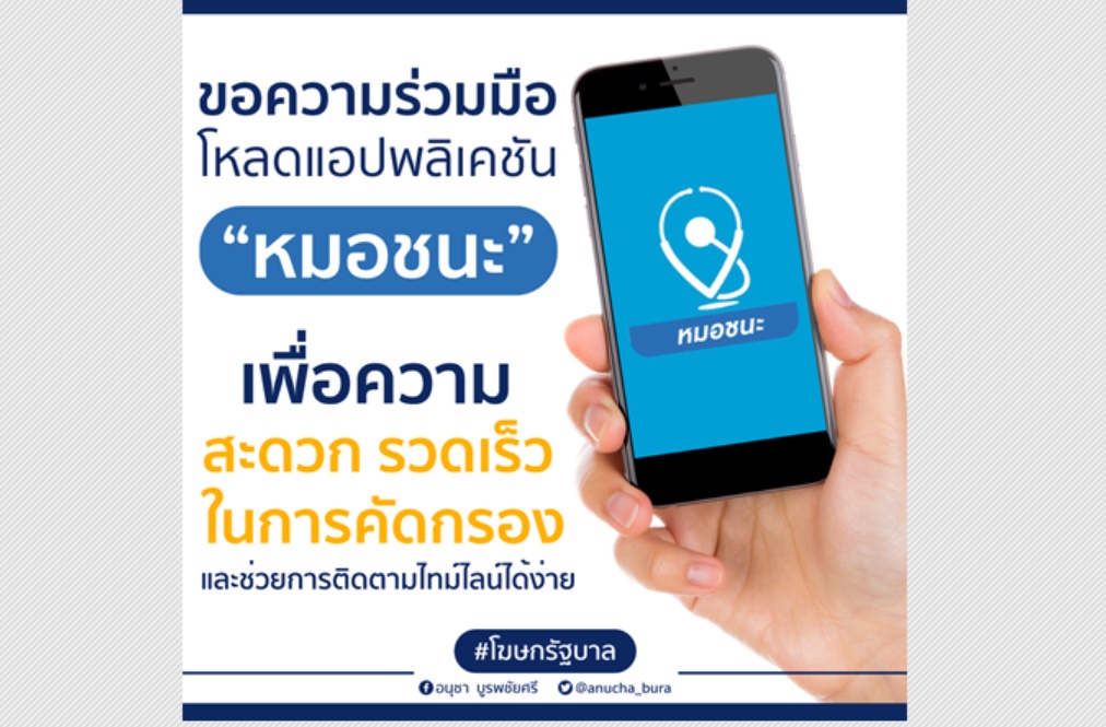 นายอนุชา บูรพชัยศรี โฆษกสำนักนายกรัฐมนตรี เปิดเผยว่า ขอความร่วมมือประชาชน โหลดแอปพลิเคชั่น “หมอชนะ” เพื่อความสะดวก รวดเร็ว ในการคัดกรอง และช่วยการติดตามไทม์ไลน์ได้ง่าย