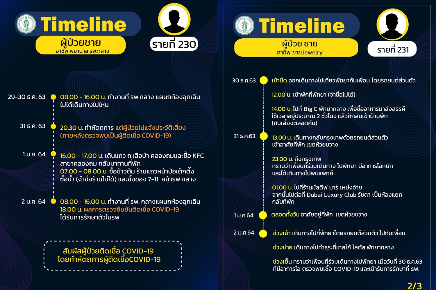Timeline แถลงไปแล้ว 229 ราย (วันที่ 20 ธ.ค. ถึง 4 ม.ค.) และ วันนี้ มี Timeline ผู้ติดเชื้อที่อยู่ใน กทม. ซึ่งได้สอบสวนโรคเสร็จเรียบร้อยแล้ว เพิ่มอีก 24 ราย Time line 24 ราย มีรายละเอียดตามรูปด้านล่าง