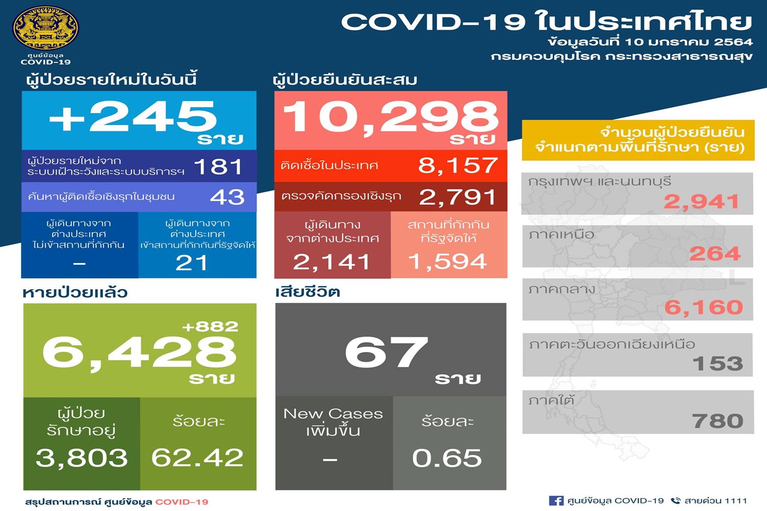 ศบค.แถลงไทยป่วยโควิดเพิ่ม 245 ราย เป็นติดเชื้อในประเทศ 181 ราย ผู้ป่วยได้รับการรักษาหายเพิ่ม 882 ราย เหลือรักษาอยู่ 3,803 ราย