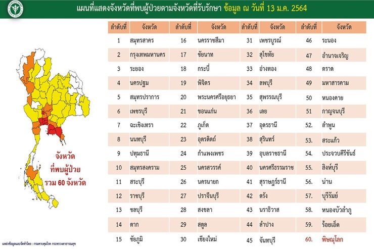 เมื่อวันที่ 13 ม.ค. 64 นพ.ทวีศิลป์ วิษณุโยธิน โฆษกศูนย์บริหารสถานการณ์โควิด-19 (ศบค.) เปิดเผยระหว่างการแถลงข่าวสถานการณ์ระบาดของเชื้อโควิด-19ประจำวันว่า ล่าสุดมีจังหวัดที่พบผู้ติดเชื้อโควิดเพิ่มขึ้นอีก 1 จังหวัด คือ พิษณุโลก ทำให้ปัจจุบันประเทศไทยมีผู้ป่วยโควิดกระจายอยู่ในพื้นที่ 60 จังหวัดทั่วประเทศ โดยผู้ติดเชื้อในจ.พิษณุโลก เป็นผู้ที่ทำงานอยู่ในบริษัทขนส่งสินค้าของเอกชน มีภูมิลำเนาอยู่ที่หนองบัวลำภู เดินทางไป 2 ที่ มีไข้ ไอ และผลตรวจออกมาเมื่อวันที่ 11 มกราคม 2564 พบว่าติดเชื้อ
