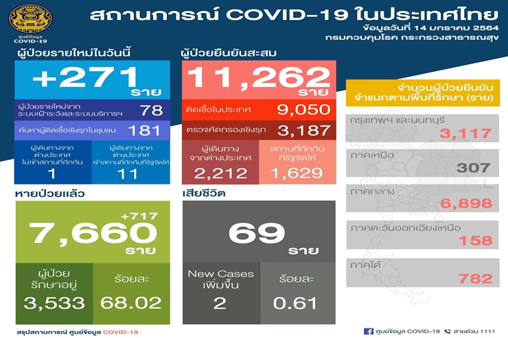เมื่อวันที่ 14 ม.ค. 64 นพ.ทวีศิลป์ วิษณุโยธิน โฆษกศูนย์บริหารสถานการณ์โควิด-19 แถลงสถานการณ์ระบาดของเชื้อไวรัสโควิด-19 ประจำวัน ดังนี้