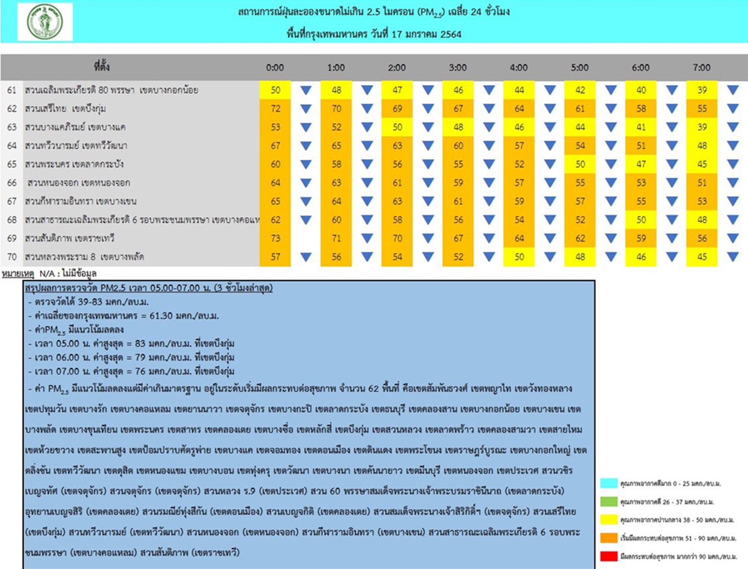 เมื่อวันที่ 17 ม.ค. ศูนย์ประสานงานและแก้ไขปัญหามลพิษทางอากาศของพื้นที่กรุงเทพมหานคร สรุปผลการตรวจวัด PM2.5 ช่วงเวลา 05.00-07.00 น. ตรวจวัดได้ 39-83 มคก./ลบ.ม. ค่าเฉลี่ยของในกรุงเทพฯ 61.30 มคก./ลบ.ม. ขณะที่ ค่า PM2.5 มีแนวโน้มลดลงแต่มีค่าเกินมาตรฐาน อยู่ในระดับเริ่มมีผลกระทบต่อสุขภาพ จำนวน 62 พื้นที่