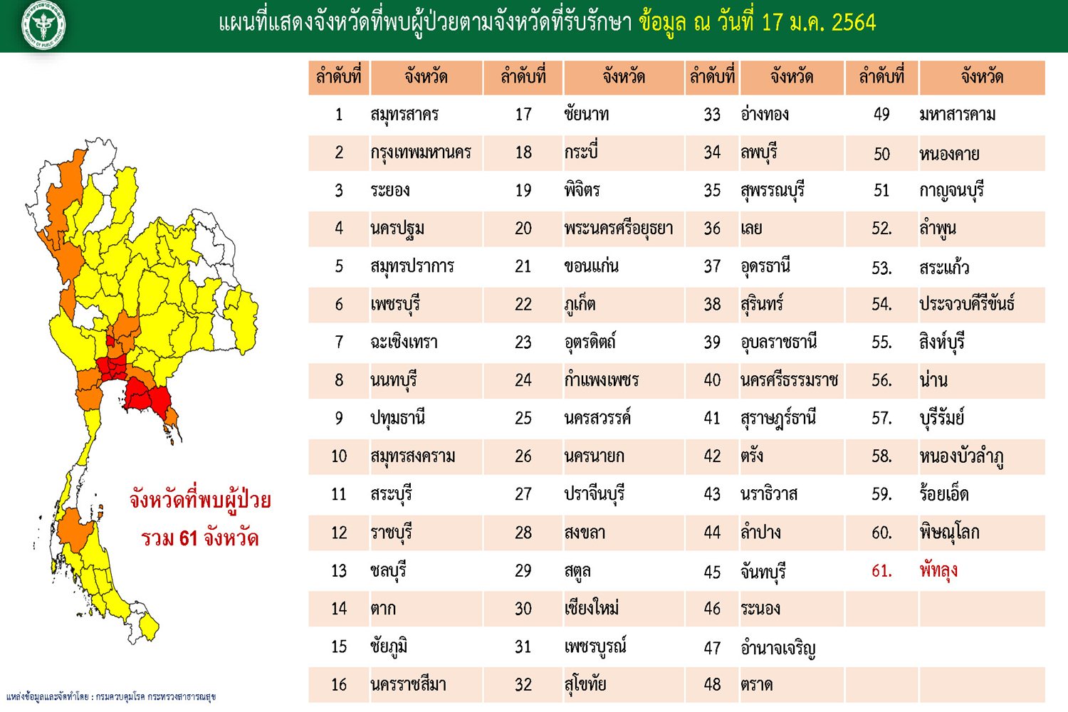 ทั่วประเทศติดโควิดเพิ่มเป็น61จังหวัด ล่าสุดพบที่ "พัทลุง"