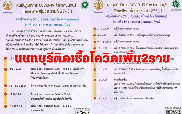 โดยไทม์ไลน์ ผู้ป่วยรายที่ 274 (รายที่ 158 ของการระบาดระลอกใหม่) เป็นชายอายุ 38 ปี อ.ปากเกร็ด พบประวัติขับรถสองแถวประจำทาง วิ่งระหว่างวัดโพธิ์ทองบน-ตลาดปากเกร็ด วันละ 4-5 รอบเช้า ช่วงเวลา 06.00-09.00 น. รอบเย็น 16.00-19.00 น. โดยนั่งหน้าคนเดียว ไม่ได้ให้ผู้โดยนั่งร่วมด้วย และเปิดแอร์ขับรถตลอดเวลาไม่ใส่หน้ากากมีนั่งรถไปกับน้องที่สนิท ไปร้านขายส่งเครื่องไฟฟ้า อ.ลำลูกกา จ.ปทุมธานี