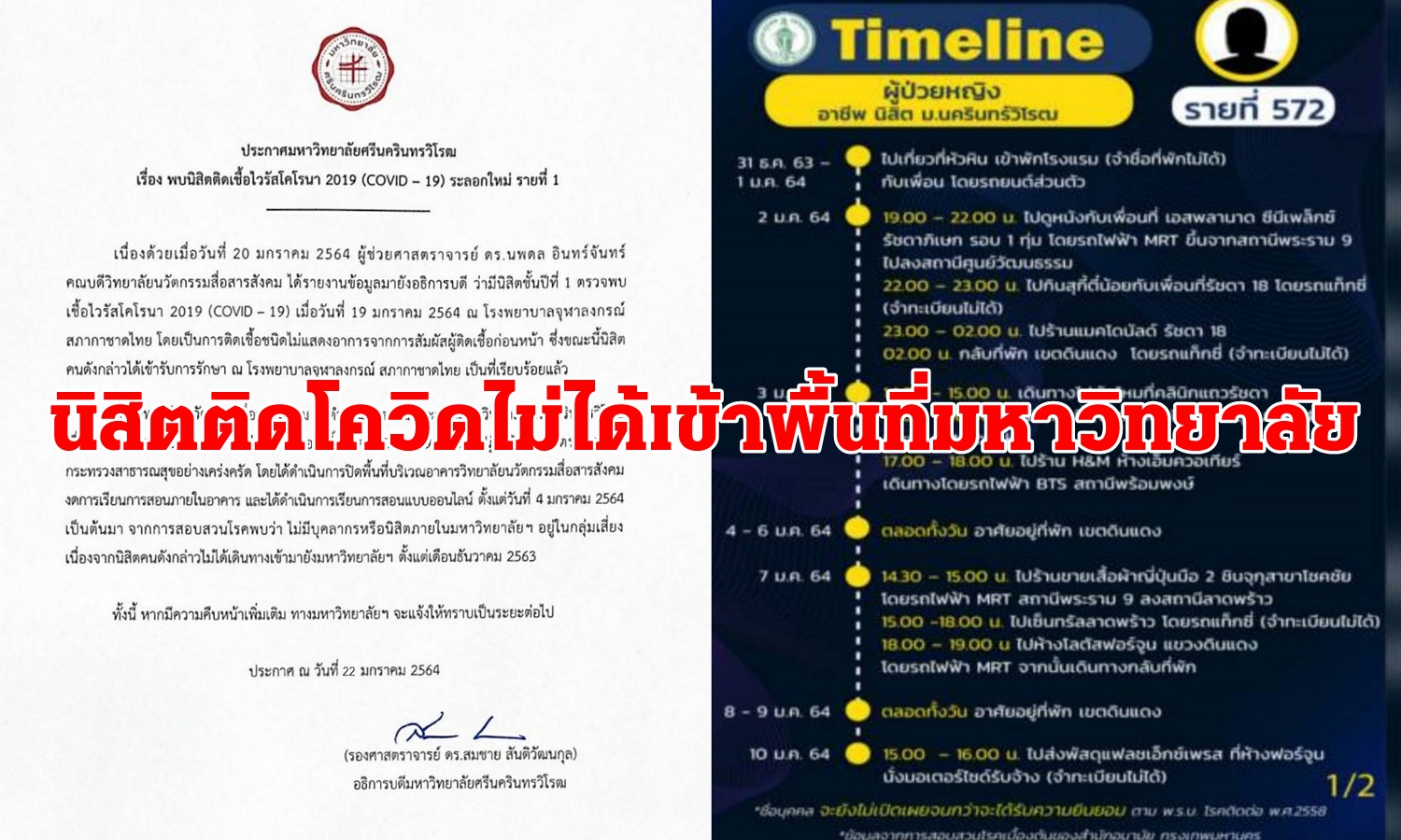 ล่าสุด มหาวิทยาลัยศรีนครินทรวิโรฒ ออกประกาศเรื่อง พบนิสิตติดเชื้อโควิด-19 ระลอกใหม่รายที่ 1 โดยผู้ช่วยศาสตราจารย์ ดร.นพดล อินทร์จันทร์ คณบดีวิทยาลัยนวัตกรรมสื่อสารสังคม ได้รายงานข้อมูลต่อรองศาสตราจารย์สมชาย สันติวัฒนกุล อธิบการดีแล้ว ขณะนี้นิสิตเข้ารับการรักษา ที่โรงพยาบาลจุฬาลงกรณ์ สภากาชาดไทย เป็นการติดเชื้อไม่แสดงอาการจากการสัมผัสผู้ตดเชื้อก่อนหน้า