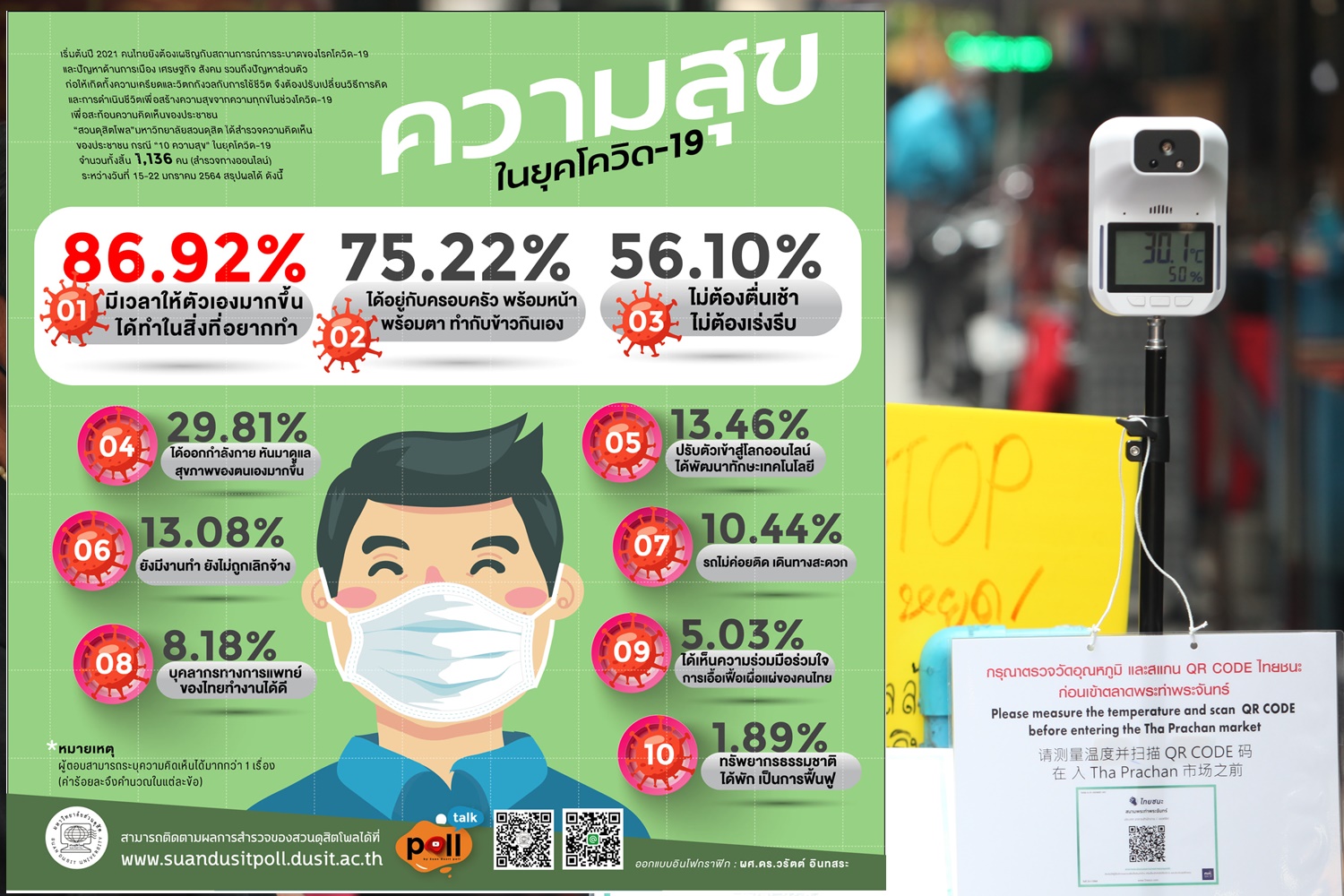 นางสาวพรพรรณ บัวทอง นักวิจัย สวนดุสิตโพล มหาวิทยาลัยสวนดุสิต กล่าวว่า จากผลการสำรวจ พบว่า ในความทุกข์ที่เกิดจากโควิด-19 ประชาชนก็ยังมีความรู้สึกสุขใจอยู่บ้าง โดยเฉพาะในด้านเวลา ทั้งการให้เวลากับตนเอง การให้เวลากับครอบครัว เงื่อนไขเรื่องเวลานี้ทำให้ผู้คนได้มีโอกาสในการคิดพิจารณาและทำสิ่งต่าง ๆ ที่ไม่เคยได้ทำมากขึ้น อีกทั้งยังได้พัฒนาตนเองในด้านการใช้เทคโนโลยีต่าง ๆ เรียกได้ว่าต้องขอบคุณโควิด-19 ที่ทำให้คนไทยได้พลิกวิกฤตเป็นโอกาสในการพัฒนาตนเองมากขึ้น