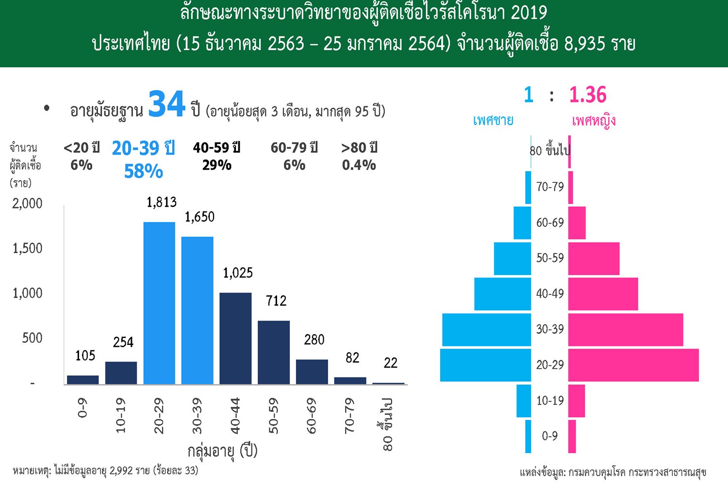 โดยผู้ป่วยอยู่ในกลุ่มอายุระหว่าง 20-29 ปีมากสุดที่ 1,813 ราย คิดเป็น 58% รองลงมา คือ กลุ่มอายุระหว่าง 40-59 ปี ที่ 1,650 ราย คิดเป็น 29% ซึ่งสองกลุ่มนี้ถือว่าเป็นกลุ่มที่อยู่ในวัยทำงาน และส่วนใหญ่เป็นการติดเชื้อแบบไม่แสดงอาการ จึงไม่รู้ตัวว่าป่วย ทำให้มีการเดินทางไปยังหลายสถานที่ และส่งผลให้มีการระบาดในกลุ่มวัยนี้มากที่สุด