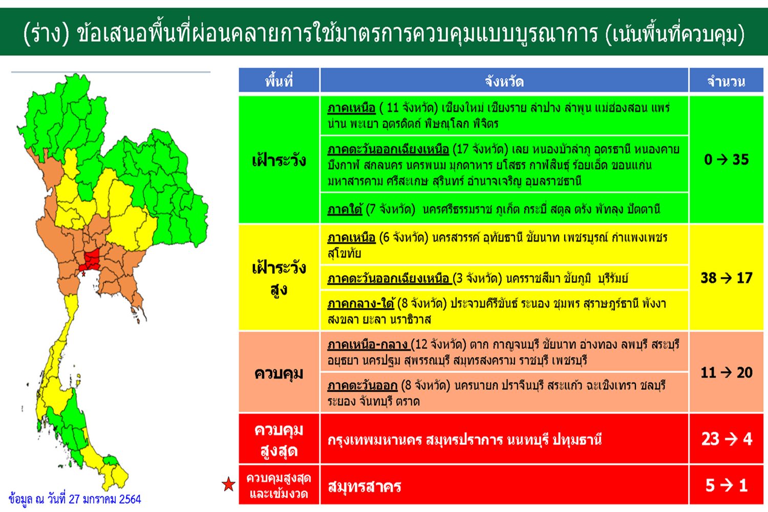ที่ประชุมศบค.ชุดเล็กได้ มีการเสนอ ร่างข้อเสนอพื้นที่ผ่อนคลายการใช้มาตรการควบคุมแบบ บูรณาการ (เน้นพื้นที่ควบคุม) โดยมีการปรับลดพื้นที่ควบคุมสูงสุดและเข้มงวด เหลือ จังหวัดสมุทรสาคร เพียงจังหวัดเดียว