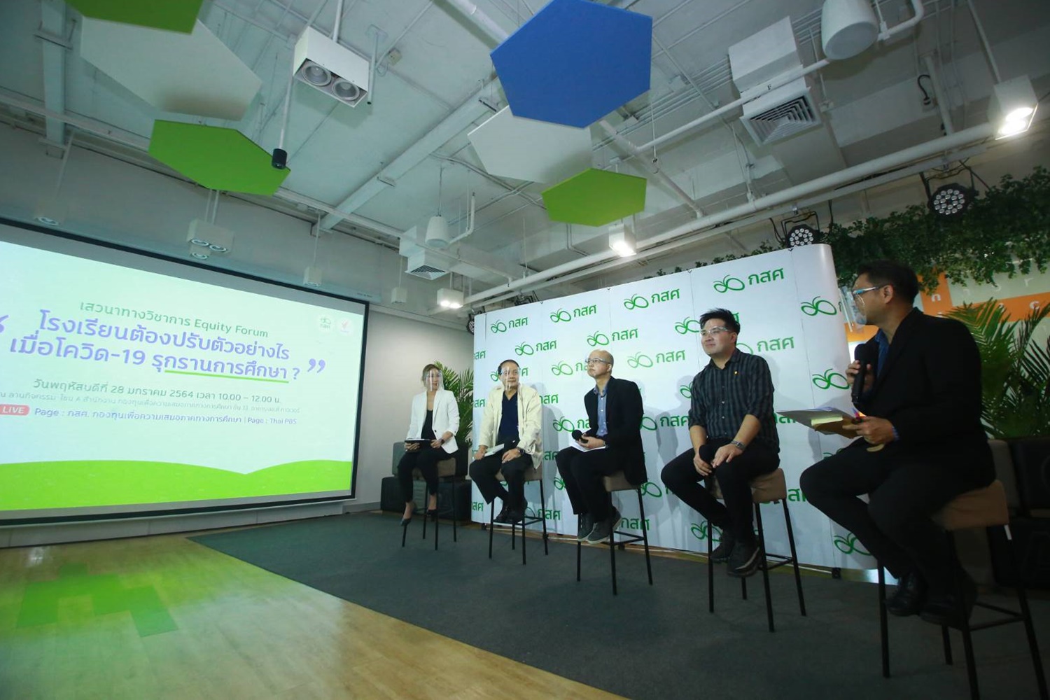 เมื่อวันที่ 28 มกราคม 2564 กองทุนเพื่อความเสมอภาคทางการศึกษา (กสศ.) จัดเสวนาวิชาการ Equity Forum ในหัวข้อ “โรงเรียนต้องปรับตัวอย่างไร เมื่อโควิด-19 รุกรานการศึกษา” โดยมีผู้ร่วมเสวนาคือ ศ.ดร.สมพงษ์ จิตระดับ ที่ปรึกษา กสศ.ดร.ภูมิศรัณย์ ทองเลี่ยมนาค ผู้เชี่ยวชาญด้านเศรษฐศาสตร์ สถาบันวิจัยเพื่อความเสมอภาคทางการศึกษา กสศ.ศ.นพ.อดิศักดิ์ ผลิตผลการพิมพ์ หัวหน้าโครงการขยายผลและพัฒนาความช่วยเหลือกลุ่มเด็กปฐมวัยและเด็กปฐมวัยนอกระบบในกรุงเทพมหานคร กสศ. ดร.นรรธพร จันทร์เฉลี่ย เสริบุตร ประธานมูลนิธิโรงเรียนสตาร์ฟิชคันทรีโฮม (เครือข่าย TSQP) รศ.ดร. ธันยวิช วิเชียรพันธ์ ผอ.สำนักวิจัยและพัฒนานวัตกรรม มหาวิทยาลัยศรีปทุม วิทยาเขตชลบุรี (เครือข่าย TSQP)และ ดร.ศุภโชค ปิยะสันต์ ผู้อำนวยการโรงเรียนห้วยไร่สามัคคี จ.เชียงราย ในฐานะที่ปรึกษาชมรมนักจัดการศึกษาบนพื้นที่สูงและถิ่นทุรกันดาร