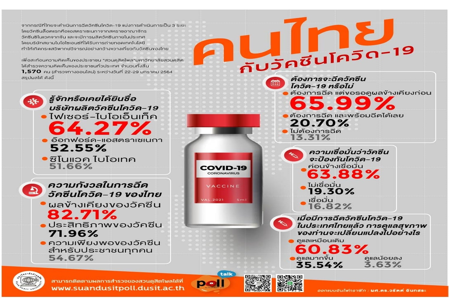 สวนดุสิตโพลมหาวิทยาลัยสวนดุสิต เปิดเผยผลสำรวจความคิดเห็นของประชาชนทั่วประเทศเรื่อง “คนไทยกับวัคซีนโควิด-19” โดยสำรวจความเห็นประชาชน จำนวนทั้งสิ้น 1,570 คน (สำรวจทางออนไลน์) ระหว่างวันที่ 22-29 มกราคม 2564 เพื่อสะท้อนความคิดเห็นจากกรณีที่ไทยจะดำเนินการฉีดวัคซีนโควิด-19 แบ่งการดำเนินการเป็น 3 ระยะ โดยวัคซีนล็อตแรกคือแอสตราเซเนกาจากสหราชอาณาจักร วัคซีนจากซิโนแวคจากจีน และจะมีการผลิตวัคซีนภายในประเทศโดยบริษัทสยามไบโอไซเอนซ์ที่ได้รับการถ่ายทอดเทคโนโลยี ทำให้เกิดกระแสวิพากษ์วิจารณ์อย่างกว้างขวางเกี่ยวกับวัคซีนของไทย สรุปผลได้ ดังนี้