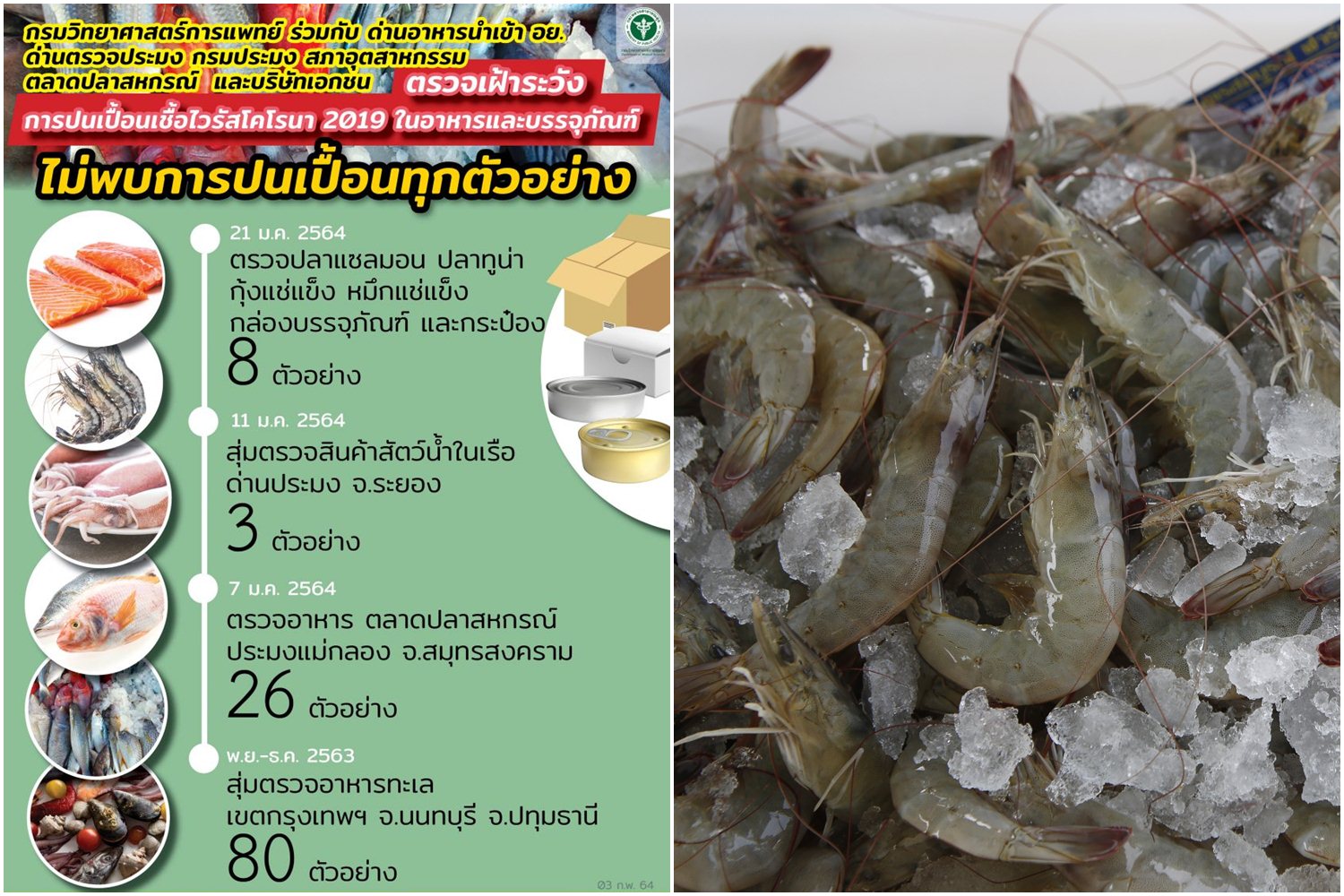 กรมวิทยาศาสตร์การแพทย์ เผยผลตรวจการปนเปื้อนเชื้อโควิด-19 ในอาหารทะเลและบรรจุภัณฑ์ จำนวน 117 ตัวอย่าง ไม่พบการปนเปื้อนทุกตัวอย่าง ผู้บริโภคสามารถรับประทานอาหารทะเลได้อย่างมั่นใจในความปลอดภัย