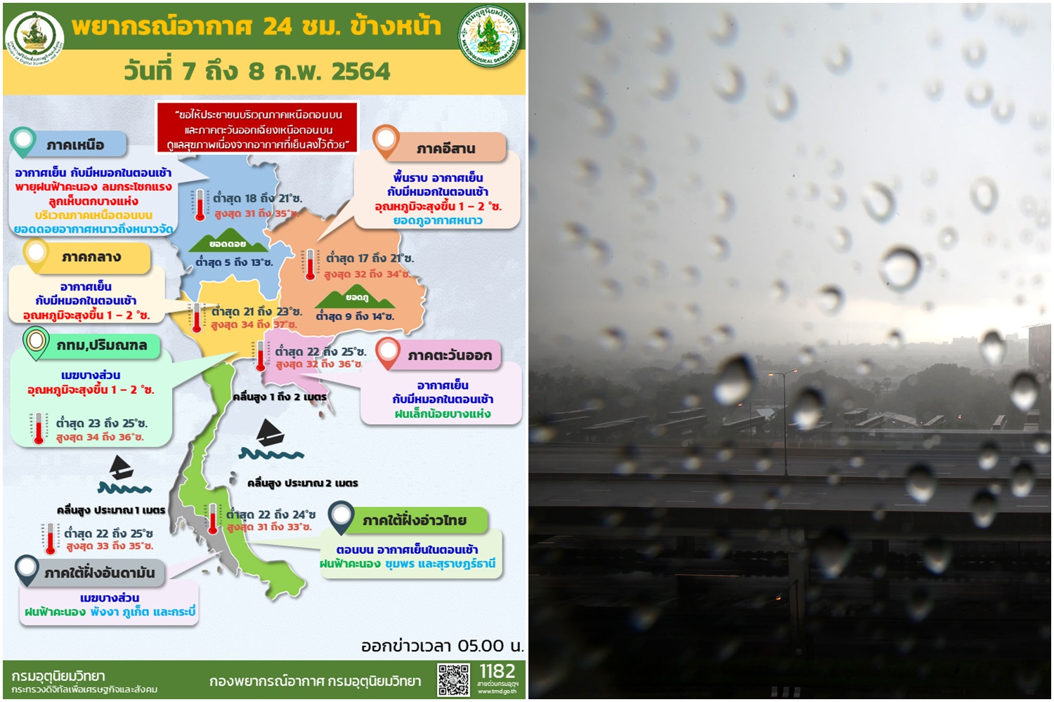 เมื่อวันที่ 7 ก.พ. 64 กรมอุตุนิยมวิทยารายงาน ลักษณะอากาศทั่วไปว่า พยากรณ์อากาศ 24 ชั่วโมงข้างหน้า คลื่นกระแสลมฝ่ายตะวันตกได้เคลื่อนผ่านประเทศเมียนมาเข้าปกคลุมบริเวณภาคเหนือตอนบน ในขณะที่บริเวณความกดอากาศสูงหรือมวลอากาศเย็นกำลังอ่อนปกคลุมประเทศไทยตอนบน ลักษณะเช่นนี้ทำให้ภาคเหนือมีพายุฝนฟ้าคะนอง ลมกระโชกแรง และมีลูกเห็บตกบางพื้นที่