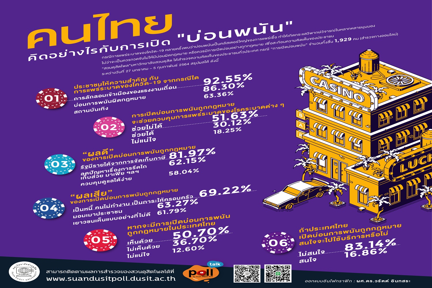 ดุสิตโพลเผยคน50.70% เห็นด้วยเปิดบ่อนพนันถูกกฎหมายในไทย แต่ห่วงคนเป็นหนี้ถูกมอมเมา ขณะที่ 83.14% ระบุไม่สนใจไปใช้บริการ