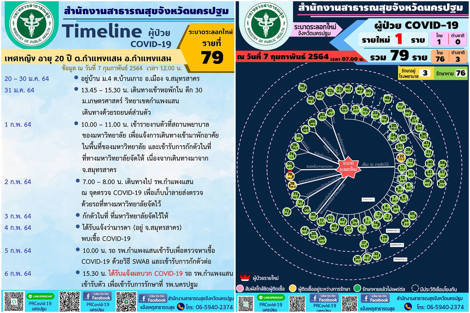 เมื่อวันที่ 7 กุมภาพันธ์ สำนักงานสาธารณสุขจังหวัดนครปฐม เปิดเผยไทม์ไลน์ ผู้ป่วยรายที่ 79 เป็นสุภาพสตรี อายุ 20 ปี ชาวต.บ้านเกาะ อ.เมือง จ.สมุทรสาคร และเป็นนักศึกษามหาวิทยาลัยเกษตรศาสตร์ วิทยาเขตกำแพงแสน เดินทางมามหาวิทยาลัยฯ เมื่อวันที่ 31 มกราคม( ตึก 30 ) วันที่ 1 กุมภาพันธ์ เข้ารายงานตัวที่สถานพยาบาลฯ เพื่อแจ้งการเดินทางมาพักในพื้นที่มหาวิทยาลัย และเข้ารับการกักตัวในที่มหาวิทยาลัยฯจัดไว้ เนื่องจากเดินทางมาจากจังหวัดสมุทรสาคร