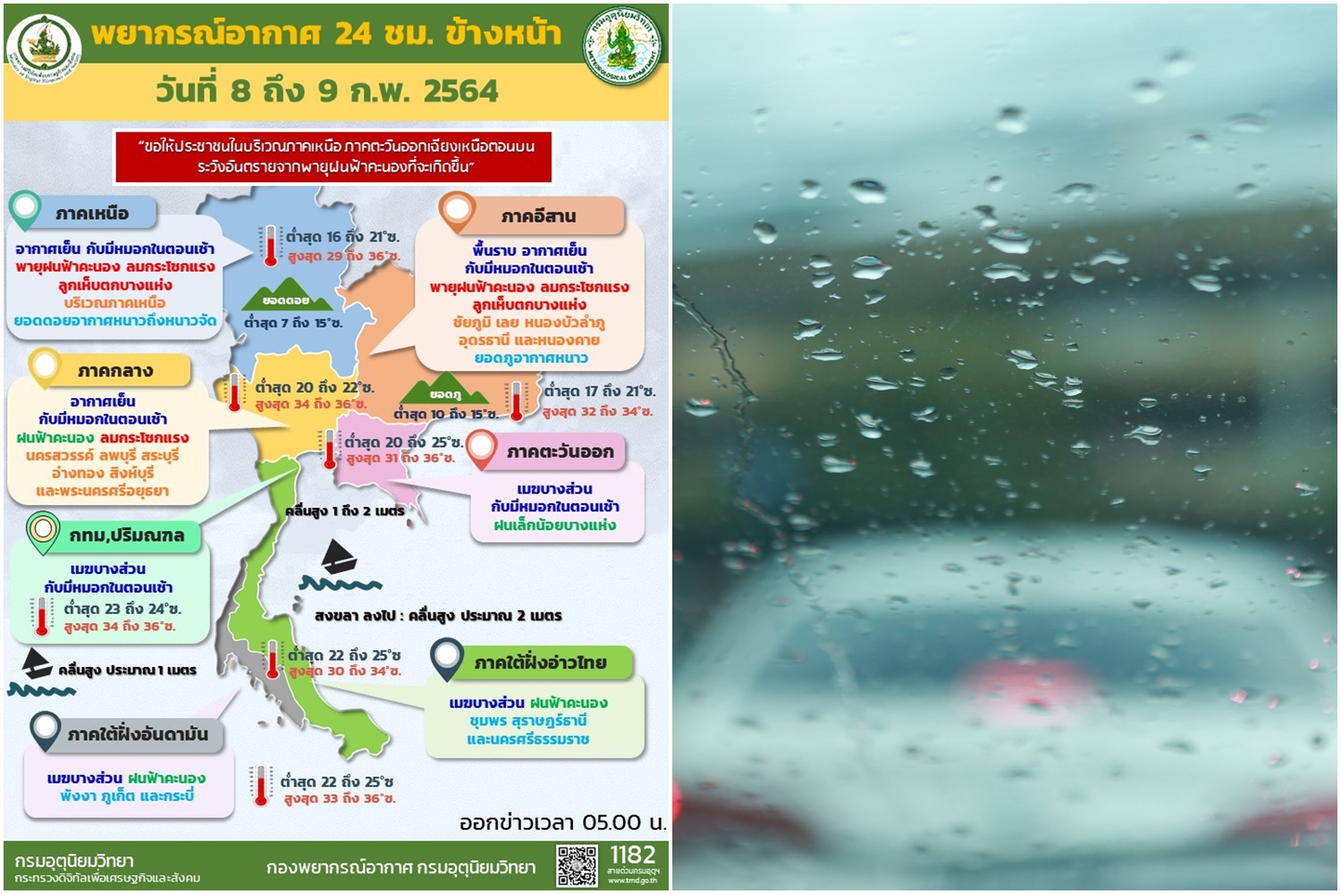 เมื่อวันที่ 8 ก.พ. 64 กรมอุตุนิยมวิทยารายงาน ลักษณะอากาศทั่วไปว่า พยากรณ์อากาศ 24 ชั่วโมงข้างหน้า คลื่นกระแสลมฝ่ายตะวันตกได้เคลื่อนผ่านประเทศเมียนมาเข้าปกคลุมบริเวณภาคเหนือตอนบน และประเทศลาวลักษณะเช่นนี้ทำให้ภาคเหนือและภาคตะวันออกเฉียงเหนือตอนบนมีพายุฝนฟ้าคะนอง ลมกระโชกแรง และมีลูกเห็บตกบางพื้นที่
