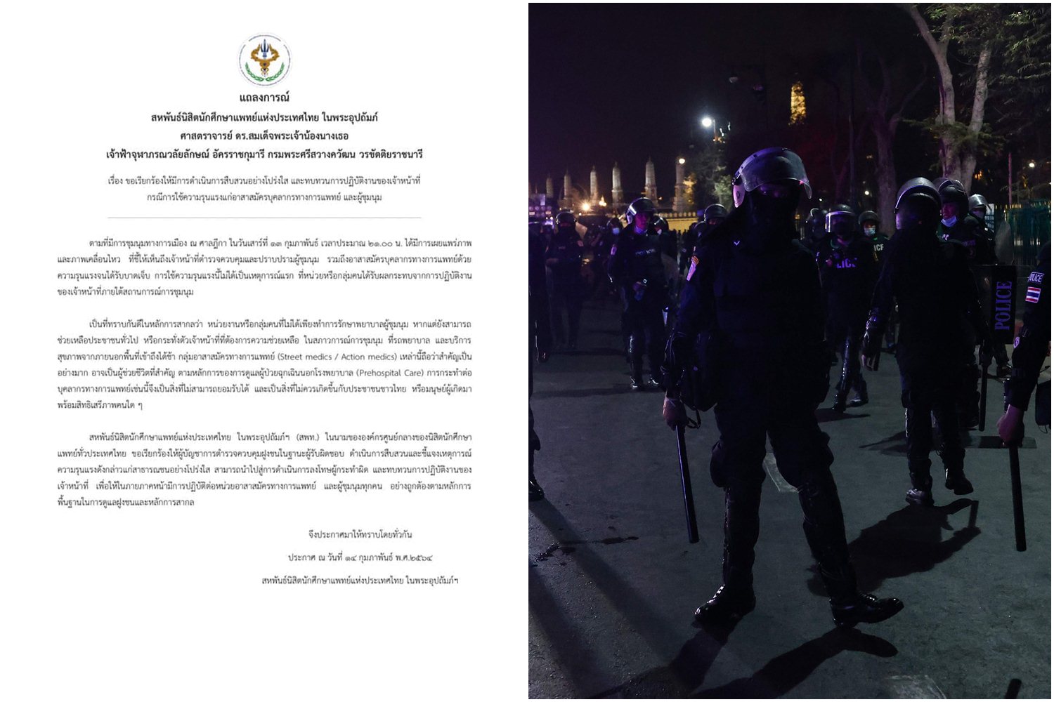สหพันธ์นิสิตนักศึกษาแพทย์แห่งประเทศไทย ในพระอุปถัมภ์ฯ เรียกร้องตำรวจสอบสวน ทบทวนการปฏิบัติงานกรณีใช้ความรุนแรงแก่อาสาสมัครบุคลากรทางการแพทย์ และผู้ชุมนุม