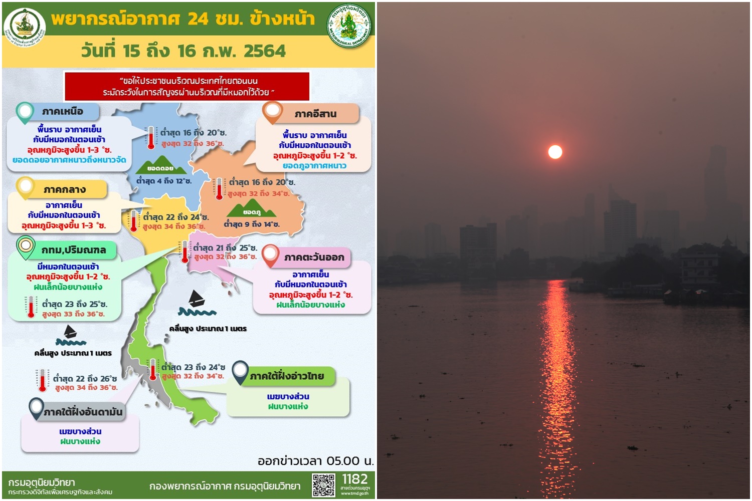 เมื่อวันที่ 15 ก.พ. 64 กรมอุตุนิยมวิทยารายงาน ลักษณะอากาศทั่วไปว่า พยากรณ์อากาศ 24 ชั่วโมงข้างหน้า บริเวณความกดอากาศสูงหรือมวลอากาศเย็นกำลังอ่อนปกคลุมบริเวณประเทศไทยตอนบนและทะเลจีนใต้ ทำให้บริเวณดังกล่าวมีอุณหภูมิสูงขึ้น 1-3 องศาเซลเซียส แต่ยังคงมีอากาศเย็นกับมีหมอกในตอนเช้า ขอให้ประชาชนบริเวณประเทศไทยตอนบนระมัดระวังในการสัญจรผ่านบริเวณที่มีหมอกไว้ด้วย