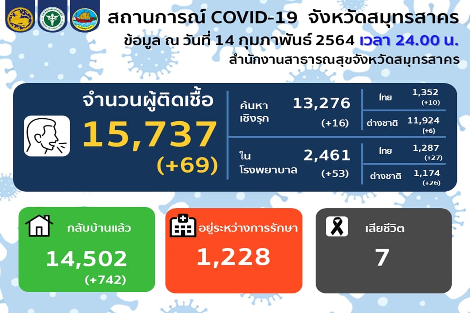 สำนักงานสาธารณสุขจังหวัดสมุทรสาคร รายงานข้อมูลจำนวนผู้ติดเชื้อโควิด-19 ในจังหวัดสมุทรสาคร ณ เวลา 24.00 น. วันที่ 14 ก.พ. 64 พบผู้ติดเชื้อรายใหม่จำนวน 69 ราย แบ่งเป็น จากการตรวจในโรงพยาบาล 53 ราย เป็นคนไทย 27 ราย ต่างชาติ 26 ราย , ผู้ติดเชื้อจากการค้นหาคัดกรองเชิงรุก 16 ราย เป็นคนไทย 10 ราย ต่างชาติ 6 ราย