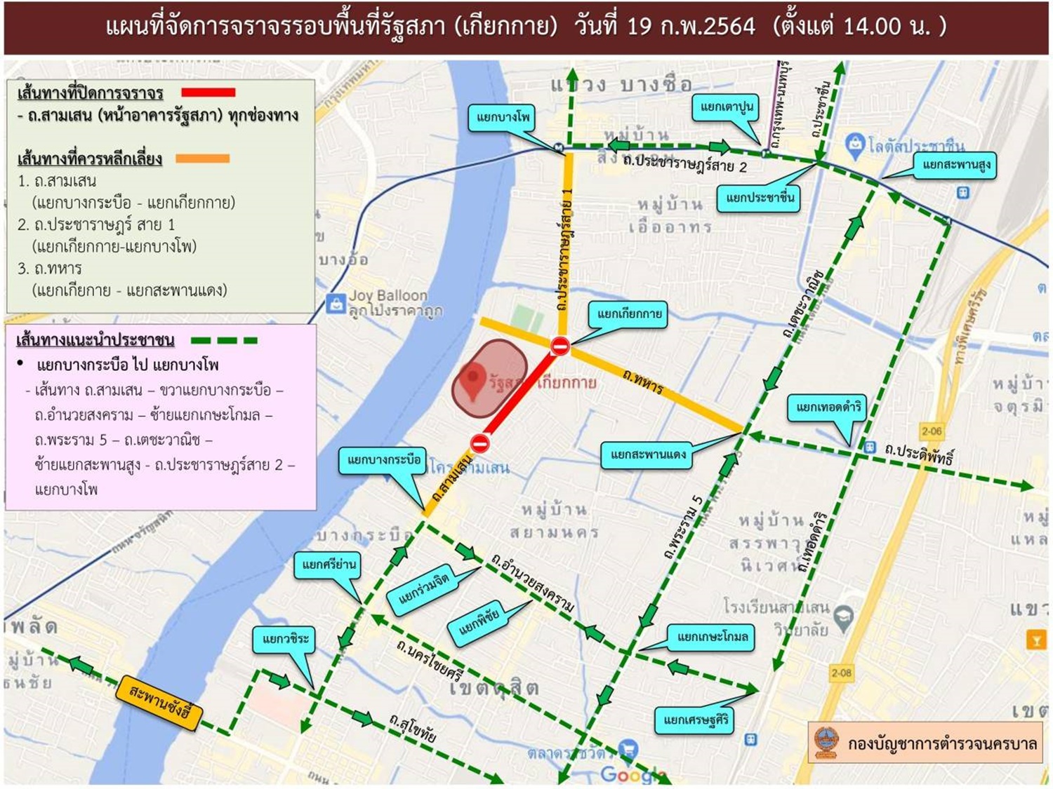 ตำรวจนครบาล แนะเลี่ยงเส้นทางรอบรัฐสภา (เกียกกาย) กรณีมีผู้มาชุมนุม อาจส่งผลกระทบการจราจร