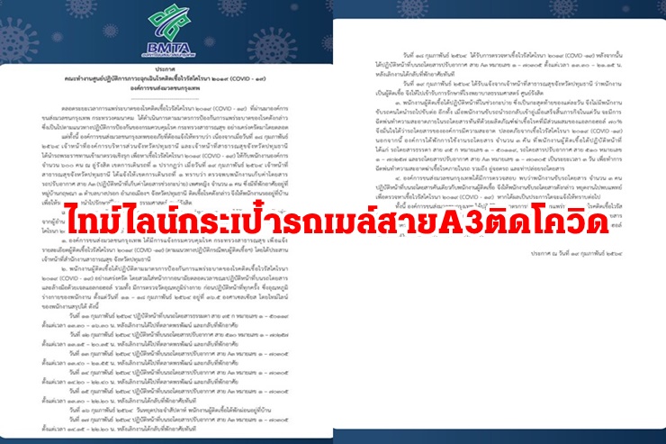 องค์การขนส่งมวลชนกรุงเทพ หรือ ขสมก. ออกเอกสาร แจ้งว่า เมื่อวันที่ 19 กพ.2564 เจ้าหน้าที่สาธารณสุขจังหวัดปทุมธานี ได้แจ้งให้เขตการเดินรถที่ 1 ทราบว่า ตรวจพบพนักงานเก็บค่าโดยสารรถปรับอากาศ สาย A3 สนามบินดอนเมือง – สวนลุมพินี ปฏิบัติหน้าที่เก็บค่าโดยสารช่วงกะบ่าย เพศหญิง จำนวน 1 คน ซึ่งมีที่พักอาศัยอยู่ที่หมู่บ้านกฤษณา 1 ตำบลบางปรอก อำเภอเมือง จังหวัดปทุมธานี ติดเชื้อโรคโควิด-19 จึงให้พนักงานรออยู่ที่บ้าน เพื่อให้รถพยาบาลนำไปรักษาที่โรงพยาบาลธรรมศาสตร์ ศูนย์รังสิต ขสมก. ได้รับทราบข้อมูลดังกล่าว จากผู้อำนวยการเขตการเดินรถที่ 1 จึงได้ดำเนินการตามมาตรการป้องกันการแพร่ระบาดของโรคติดเชื้อไวรัสโคโรนา 2019 (COVID – 19) ดังต่อไปนี้