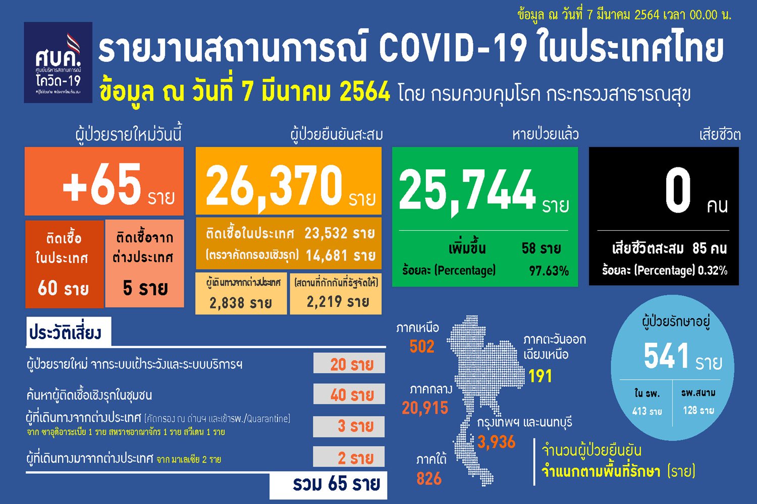 เมื่อวันที่ 7 มี.ค.64 ศูนย์บริหารสถานการณ์โควิด-19 (ศบค.) รายงานสถานการณ์การแพร่ระบาดของไวรัสโควิด-19 ในประเทศประจำวันดังนี้