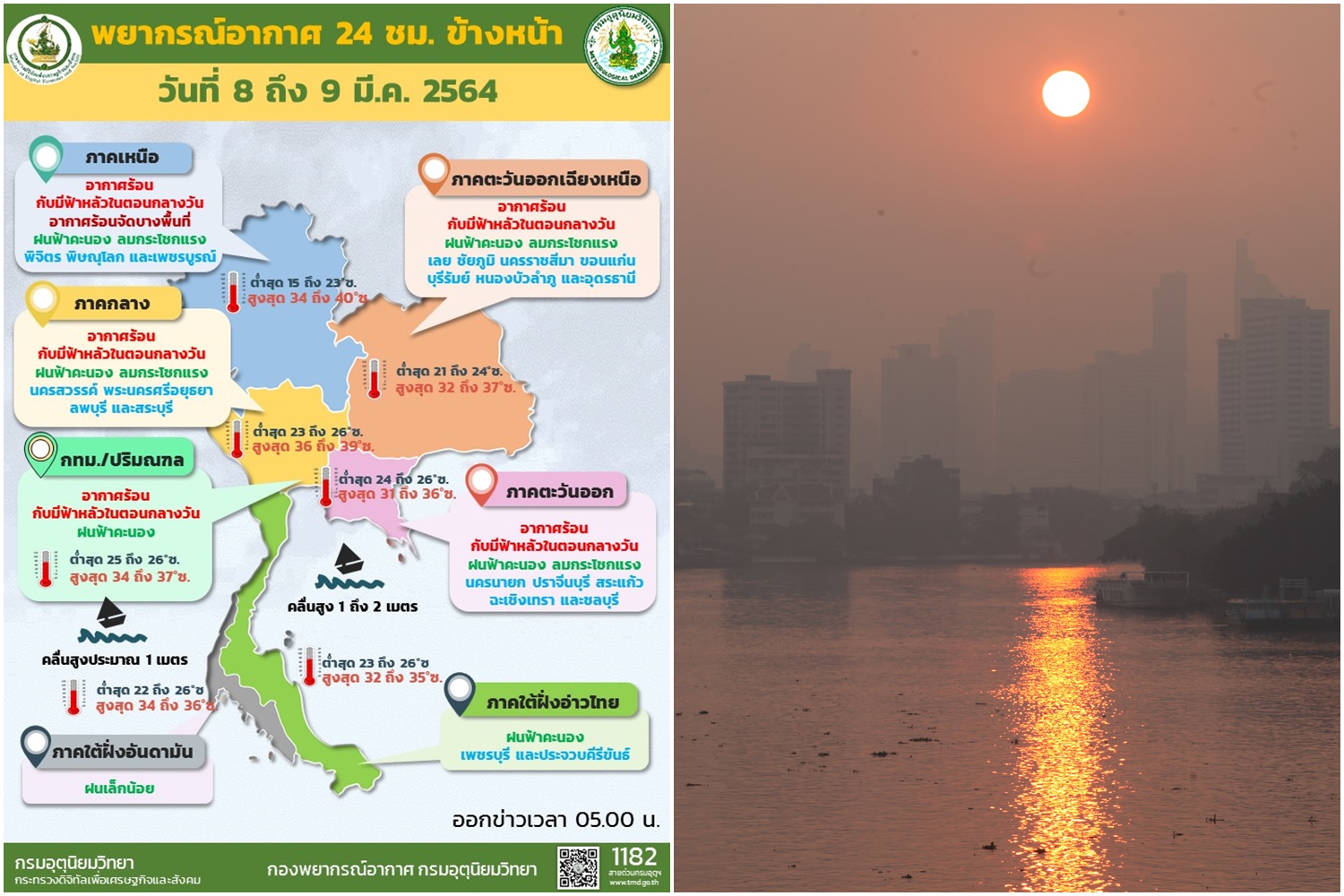 เมื่อวันที่ 8 มี.ค. 64 กรมอุตุนิยมวิทยา รายงานลักษณะอากาศทั่วไปว่า พยากรณ์อากาศ 24 ชั่วโมงข้างหน้า บริเวณความกดอากาศสูงกำลังปานกลางจากประเทศจีนได้แผ่ลงมาปกคลุมภาคตะวันออกเฉียงเหนือและทะเลจีนใต้ ในขณะที่ประเทศไทยตอนบนมีอากาศร้อน กับมีลมใต้และลมตะวันออกเฉียงใต้พัดนำความชื้นจากทะเลจีนใต้และอ่าวไทยเข้ามาปกคลุมภาคเหนือตอนล่างภาคตะวันออกเฉียงเหนือ ภาคกลาง และภาคตะวันออก รวมทั้งกรุงเทพมหานครและปริมณฑล