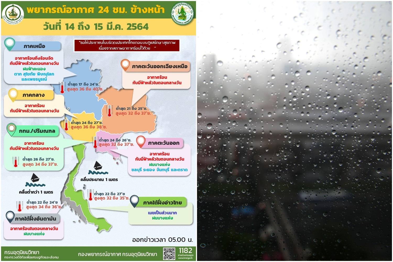เมื่อวันที่ 14 มี.ค. 64 กรมอุตุนิยมวิทยารายงาน ลักษณะอากาศทั่วไปว่า พยากรณ์อากาศ 24 ชั่วโมงข้างหน้า หย่อมความกดอากาศต่ำเนื่องจากความร้อนปกคลุมประเทศไทยตอนบน ประกอบกับมีลมใต้และลมตะวันออกเฉียงใต้พัดนำความชื้นเข้ามาปกคลุมภาคเหนือตอนล่าง ภาคกลาง ภาคตะวันออก รวมทั้งกรุงเทพมหานครและปริมณฑล ลักษณะเช่นนี้ทำให้ประเทศไทยตอนบนมีอากาศร้อนถึงร้อนจัดบางพื้นที่ กับมีฟ้าหลัวในตอนกลางวัน โดยมีฝนบางแห่งบริเวณภาคเหนือตอนล่าง และภาคตะวันออก ขอให้ประชาชนในบริเวณประเทศไทยตอนบนดูแลรักษาสุขภาพเนื่องจากสภาพอากาศร้อนไว้ด้วย