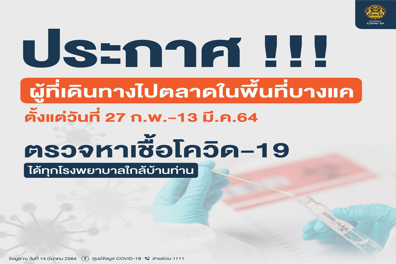 เมื่อวันที่ 14 มี.ค. 64 ศูนย์บริหารสถานการณ์โควิด-19 ได้ประกาศผ่านเพจเฟซบุ๊กศูนย์ข้อมูลโควิด-19 ระบุว่า