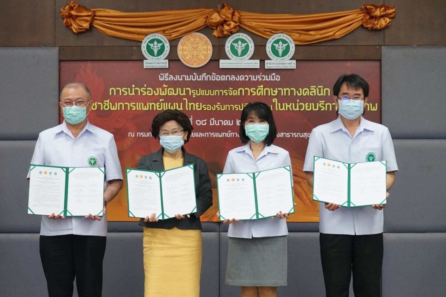 สำหรับการจัดทำหลักสูตรดังกล่าว อยู่ภายใต้การลงนามบันทึกข้อตกลงความร่วมมือ “การนำร่องพัฒนารูปแบบการจัดการศึกษาทางคลินิกสำหรับวิชาชีพแพทย์แผนไทย เพื่อรองรับการปฏิบัติงานในหน่วยบริการสุขภาพระดับตติยภูมิ” เมื่อวันที่ 18 มี.ค. 2564 ระหว่าง 4 หน่วยงาน ประกอบด้วย มธ.กรมการแพทย์แผนไทยฯ สำนักงานเขตสุขภาพที่ 5 และโรงพยาบาลราชบุรี