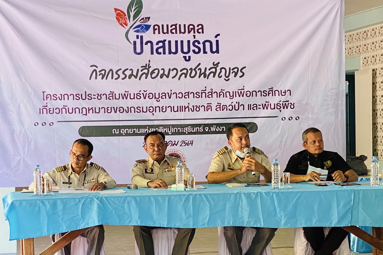 ที่ศาลาประชาคม อ.คุระบุรี จ.พังงา นายภานุมาศ สามสีเนียม ผู้อำนวยการส่วนส่งเสริมการอนุรักษ์สัตว์ป่า สำนักอนุรักษ์สัตว์ป่า กรมอุทยานแห่งชาติฯ และนายเพิ่มศักดิ์ คงแก้ว ผู้แทน ผอ.สำนักบริหารพื้นที่อนุรักษ์ที่ 5 กรมอุทยานแห่งชาติฯ พร้อมคณะผู้บริหารจากอุทยานแห่งชาติหมู่เกาะสุรินทร์ อุทยานแห่งชาติฯศรีพังงา ผู้นำชุมชนมอแกนและตัวแทนประชาชนในพื้นที่ร่วมเสวนาสื่อสัญจร ครั้งที่ 4 ภายใต้โครงการการประชาสัมพันธ์ข้อมูลข่าวสารที่สำคัญเพื่อการศึกษาเกี่ยวกับกฎหมายของกรมอุทยานแห่งชาติ
