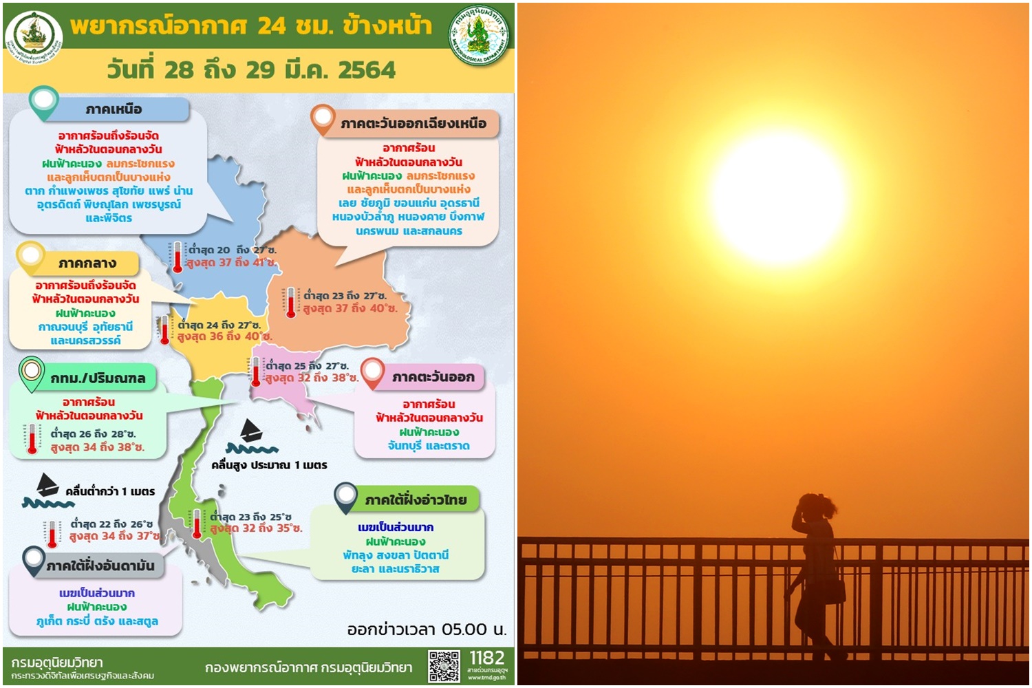เมื่อวันที่ 28 มี.ค. 64 กรมอุตุนิยมวิทยารายงานลักษณะอากาศทั่วไปว่า พยากรณ์อากาศ 24 ชั่วโมงข้างหน้า ความกดอากาศต่ำเนื่องจากความร้อนปกคลุมประเทศไทยตอนบน ทำให้บริเวณดังกล่าวมีอากาศร้อนหลายพื้นที่และมีอากาศร้อนจัดบางแห่งในภาคเหนือ ภาคตะวันออกเฉียงเหนือ และภาคกลางกับมีฟ้าหลัวในตอนกลางวัน ประกอบกับลมใต้และลมตะวันออกเฉียงใต้พัดนำความชื้นจากทะเลจีนใต้และอ่าวไทยเข้ามาปกคลุมภาคตะวันออกเฉียงเหนือ ภาคกลาง และภาคตะวันออก ทำให้บริเวณดังกล่าวมีฝนฟ้าคะนองบางพื้นที่