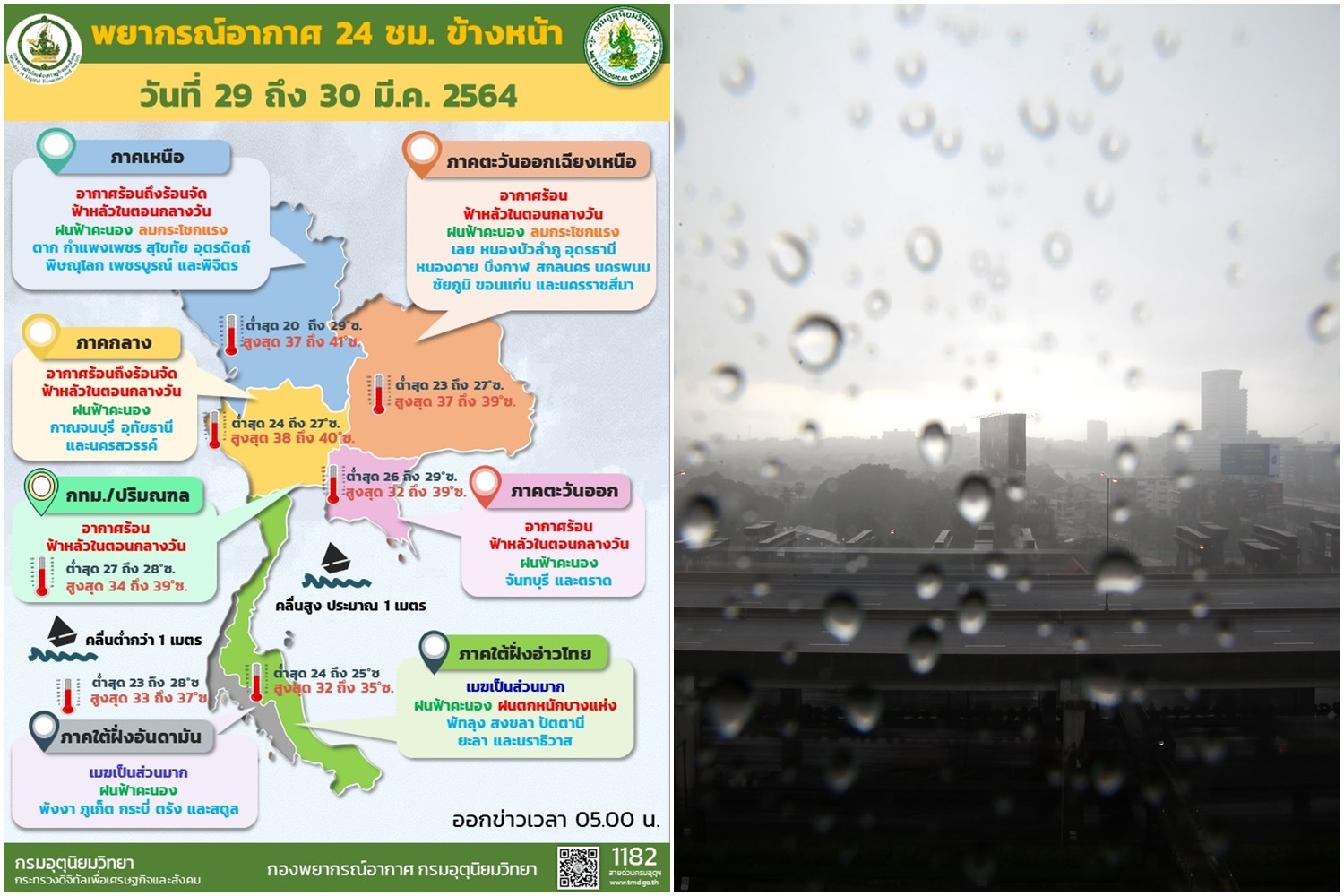 เมื่อวันที่ 29 มี.ค. 64 กรมอุตุนิยมวิทยารายงาน ลักษณะอากาศทั่วไปว่า พยากรณ์อากาศ 24 ชั่วโมงข้างหน้า ความกดอากาศต่ำเนื่องจากความร้อนปกคลุมประเทศไทยตอนบน ทำให้บริเวณดังกล่าวมีอากาศร้อนหลายพื้นที่และมีอากาศร้อนจัดบางแห่งในภาคเหนือ และภาคกลางกับมีฟ้าหลัวในตอนกลางวัน ในขณะลมใต้และลมตะวันออกเฉียงใต้พัดนำความชื้นจากทะเลจีนใต้และอ่าวไทยเข้ามาปกคลุมภาคเหนือตอนล่าง ภาคตะวันออกเฉียงเหนือ ภาคกลาง และภาคตะวันออก ทำให้บริเวณดังกล่าวมีฝนฟ้าคะนอง และลมกระโชกแรงบางพื้นที่ ขอให้ประชาชนในบริเวณดังกล่าวระวังอันตรายจากฝนฟ้าคะนอง และลมกระโชกแรงไว้ด้วย