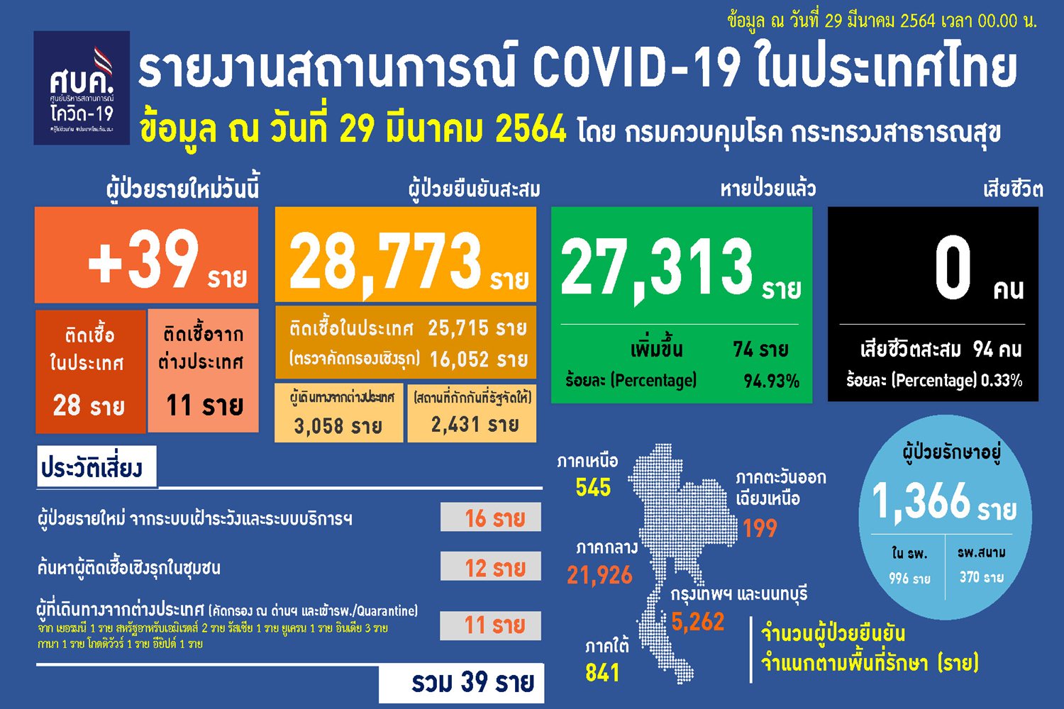 เมื่อวันที่ 29 มี.ค.64 ศูนย์บริหารสถานการณ์โควิด-19 (ศบค.) รายงานสถานการณ์การแพร่ระบาดของไวรัสโควิด-19 ในประเทศประจำวัน ดังนี้