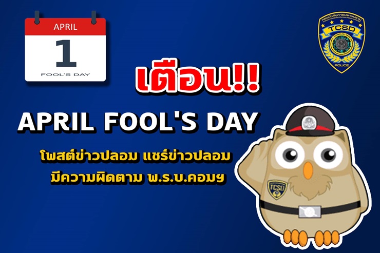 บก.ปอท. เตือน 1 เม.ย. "April Fool's Day" วันโกหก โพสต์- แชร์ข่าวปลอม ทำให้ประชาชนทั่วไปเข้าใจผิด มีความผิดตาม พ.ร.บ.คอมฯ มีโทษจำคุกและเสียค่าปรับ