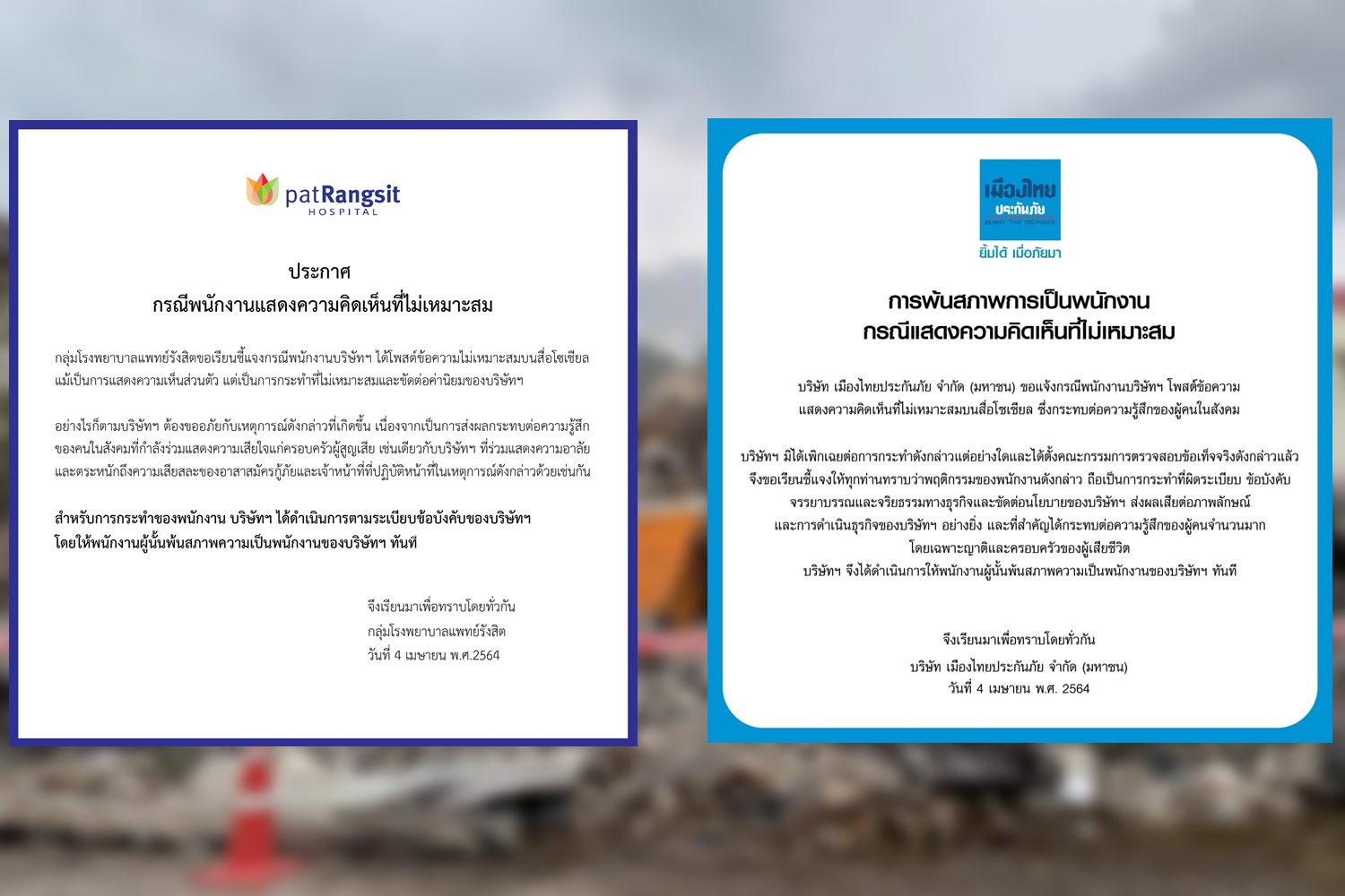 โรงพยาบาล-บริษัทประกันภัย ประกาศให้พนักงานพ้นสภาพ หลังพบแสดงความเห็นไม่เหมาะสมบนสื่อโซเชียลกรณีอาคารถล่มในหมู่บ้านกฤษดานคร 31