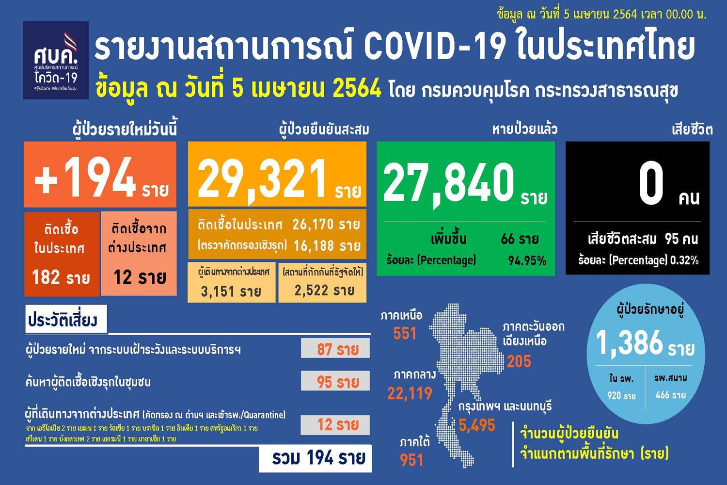 เมื่อวันที่ 5 เม.ย. 64 ศูนย์บริหารสถานการณ์โควิด-19 (ศบค.) รายงานสถานการณ์การแพร่ระบาดของไวรัสโควิด-19 ในประเทศประจำวันดังนี้