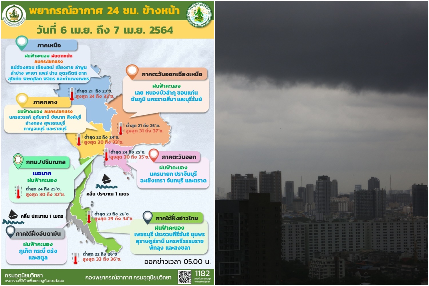 เมื่อวันที่ 6 เม.ย. 64 กรมอุตุนิยมวิทยารายงาน ลักษณะอากาศทั่วไปว่า พยากรณ์อากาศ 24 ชั่วโมงข้างหน้า บริเวณความกดอากาศสูงหรือมวลอากาศเย็นกำลังปานกลางยังคงปกคลุมประเทศไทยตอนบนและทะเลจีนใต้ ในขณะที่ลมใต้และลมตะวันออกเฉียงใต้พัดนำความชื้นจากทะเลจีนใต้และอ่าวไทยเข้ามาปกคลุมภาคเหนือตอนล่าง ภาคตะวันออกเฉียงเหนือ ภาคกลาง ภาคตะวันออก รวมทั้งกรุงเทพมหานครและปริมณฑล ประกอบกับมีคลื่นกระแสลมตะวันตกเคลื่อนเข้ามาปกคลุมภาคเหนือ