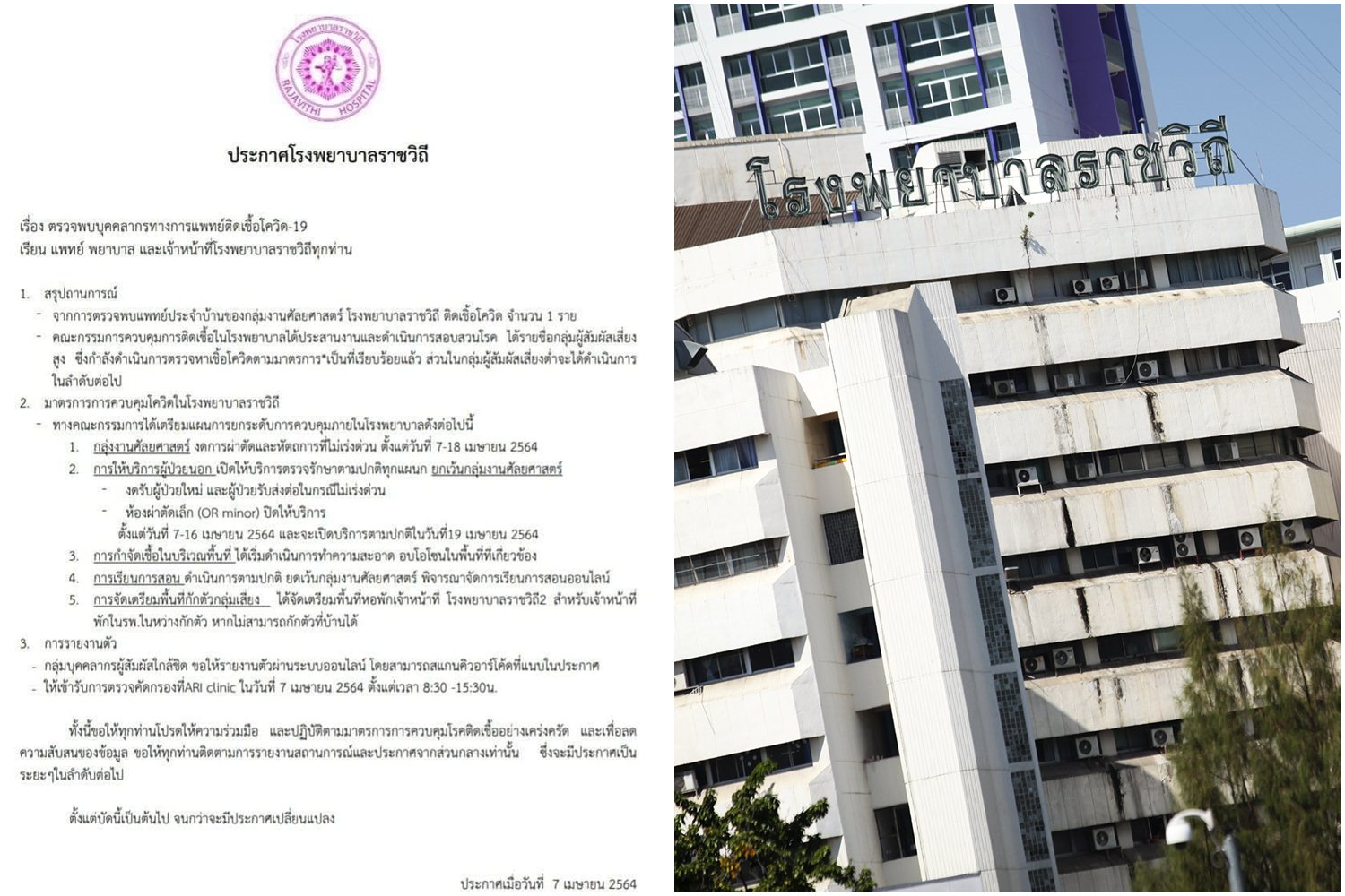 โรงพยาบาลราชวิถีประกาศพบแพทย์กลุ่มงานศัลยศาสตร์ติดโควิด 1 ราย ประกาศงดการผ่าตัดและหัตถการที่ไม่เร่งด่วน ตั้งแต่ 7 - 18 เม.ย.64 ส่วนผู้ป่วยนอกเปิดให้บริการตรวจรักษาตามปกติ