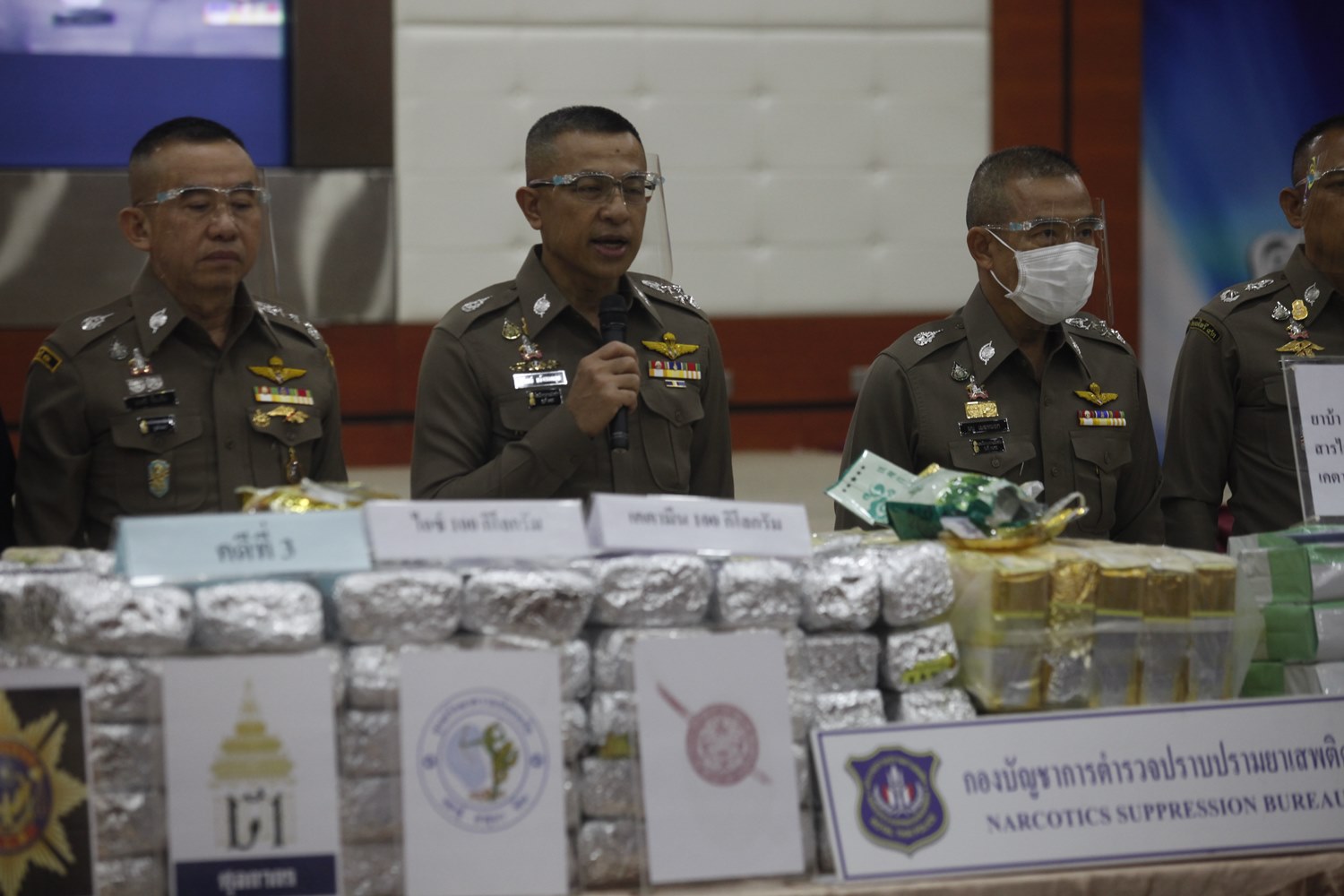 เมื่อวันที่ 7 เม.ย. ที่กองบัญชาการตำรวจปราบปรามยาเสพติด(บช.ปส.) พล.ต.อ.สุวัฒน์ แจ้งยอดสุข ผบ.ตร.พร้อมด้วย พล.ต.อ.มนู เมฆหมอก รอง ผบ.ตร.,พล.ต.ท.ชินภัทร สารสิน ผู้ช่วย ผบ.ตร.,พล.ต.ท.มนตรี ยิ้มแย้ม ผบช.ปส. ร่วมแถลงผลการจับกุมผู้ต้องหาคดีค้ายาเสพติดรายสำคัญ 5 คดี จับกุมผู้ต้องหารวมทั้งหมด 13 คน ยึดยาบ้า 8,500,000 เม็ด,ไอซ์ 271 กิโลกรัม และเคตามีน 167 กิโลกรัม